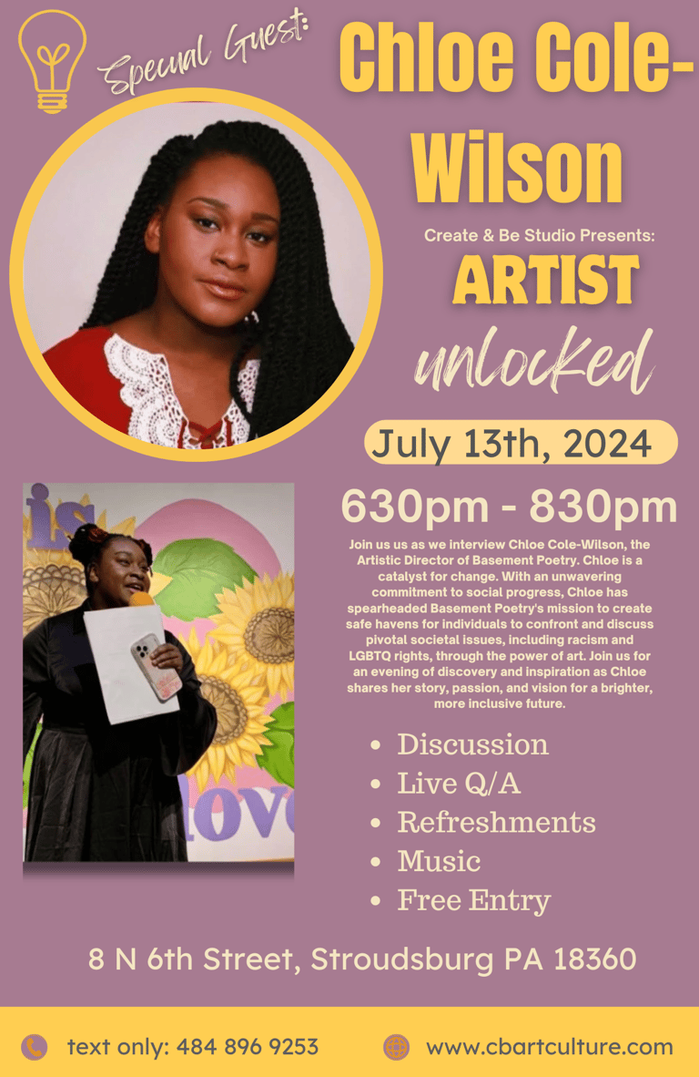 About Chloe Cole-Wilson: Chloe Cole-Wilson is more than just an artist; she's a catalyst for change. With an unwavering commitment to social progress, Chloe has spearheaded Basement Poetry's mission to create safe havens for individuals to confront and discuss pivotal societal issues, including racism and LGBTQ rights, through the power of art. Join us for an evening of discovery and inspiration as Chloe shares her story, passion, and vision for a brighter, more inclusive future.